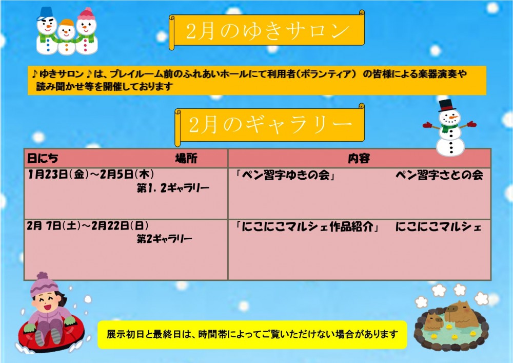 2月のゆきギャラリーの予定をお知らせします。みなさまのご来館お待ちいたしております。
