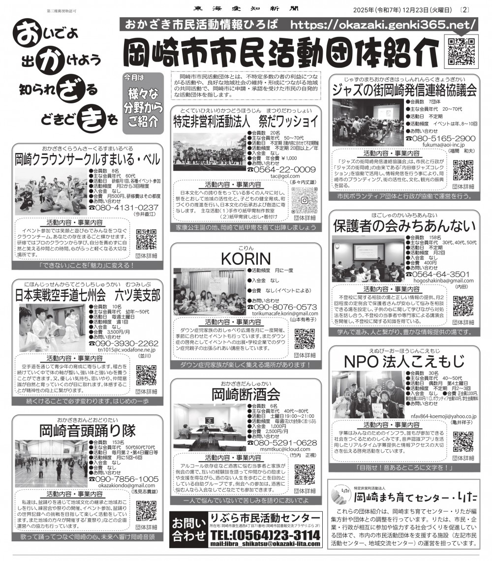 岡崎クラウンサークル すまいる・ベル/祭だワッショイ/ジャズの街岡崎発信連絡協議会/七州会/KORIN/保護者の会みちあんない/岡崎音頭踊り隊/岡崎岡崎断酒会/こえもじ
