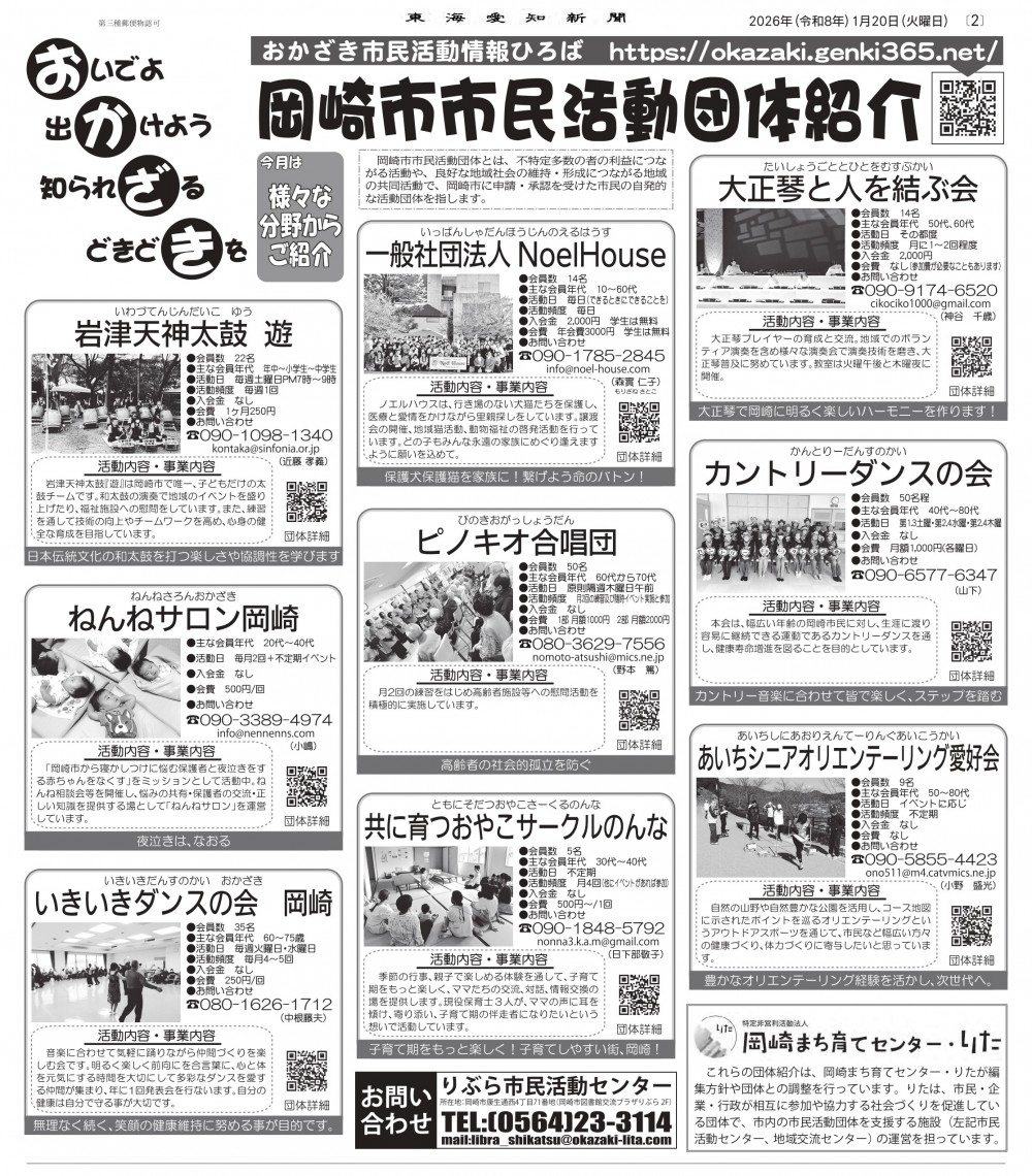 岩津天神太鼓 遊/一般社団法人NoelHouse/大正琴と人を結ぶ会/ねんねサロン岡崎/ピノキオ合唱団/カントリーダンスの会/いきいきダンスの会 岡崎/共に育つおやこサークルのんな/あいちシニアオリエンテーリング愛好会
