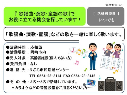「歌謡曲・演歌・童謡の歌』でお役に立てる機会を探しています!≪管理番号-23まちびとステージ≫
