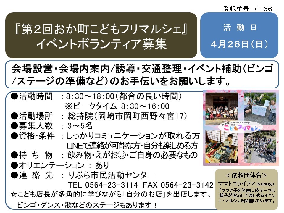 『第2回おか町こどもフリマルシェ』 イベントボランティア募集≪7-56まちびとバンク≫