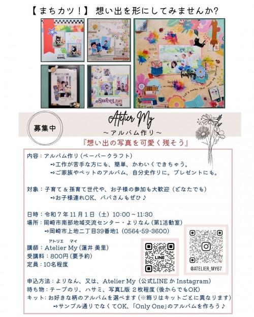 アルバム作り(ペーパークラフト)11月1日(土)10:00~11:30 よりなん1階第1活動室にて体験会を行います 工作が苦手な方にも、簡単にかわいくできちゃう。 ご家族やペットのアルバム、自分史作りに、プレゼントにも最適。 ぜひ1度興味のある方は体験してみてください。 講師:Atelier My アトリエ マイ(蓮井美里)