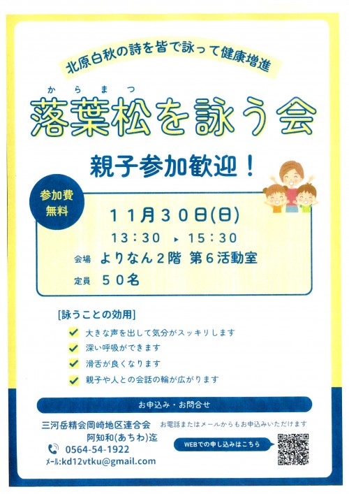 「落葉松(からまつ)」の合唱合吟を楽しみながら、腹式呼吸・滑舌の練習をします。 大きな声で詠い終わった後には気分がスッキリします。 ぜひ一度体験してみてください。 親子での参加も歓迎します。