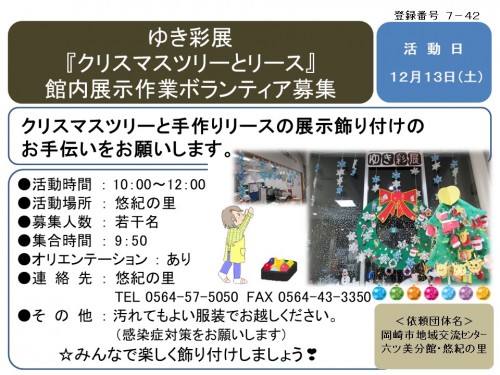 ゆき彩展 『クリスマスツリーとリース』 館内展示作業ボランティア募集≪7-42まちびとバンク≫