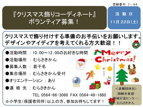 『クリスマス飾りコーディネートボランティア募集!』≪7-44まちびとバンク≫