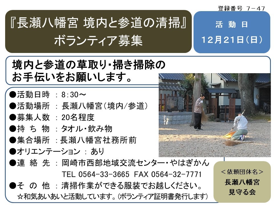 『長瀬八幡宮 境内と参道の清掃』ボランティア募集≪7-47まちびとバンク≫