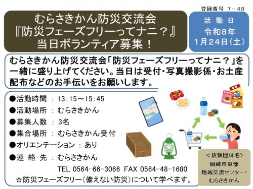 むらさきかん防災交流会「防災フェーズフリーってナニ?」を一緒に盛り上げてくれるボランティアを募集しています。 当日は受付・写真撮影係・お土産配布などをお願いします。