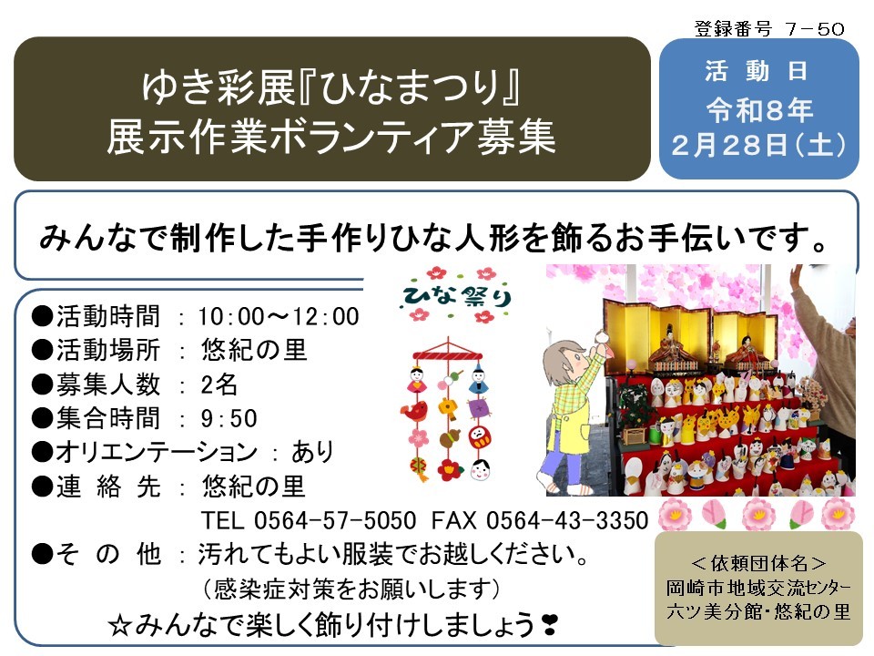 ゆき彩展『ひなまつり』 展示作業ボランティア募集≪7-50まちびとバンク≫
