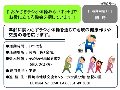 『 おかざきラジオ体操みらいネット』で お役に立てる機会を探しています!≪管理番号-42まちびとステージ≫