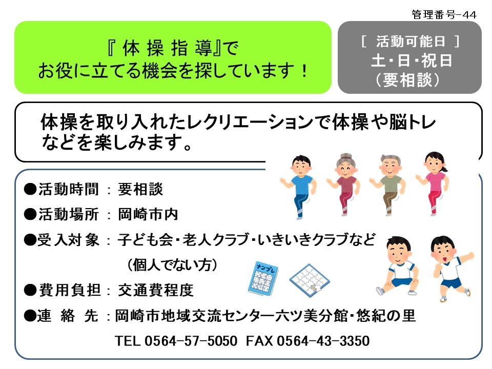 『 体操指導』で お役に立てる機会を探しています!≪管理番号-44まちびとステージ≫