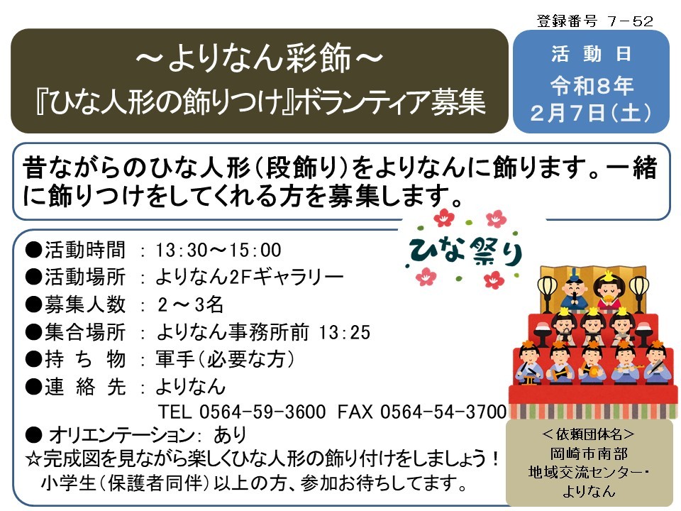 ~よりなん彩飾~『ひな人形の飾りつけ』 ボランティア募集≪7-52まちびとバンク≫