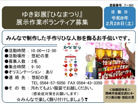 来館者が制作した手作り人形を飾るお手伝いをしていただくボランティア募集です。