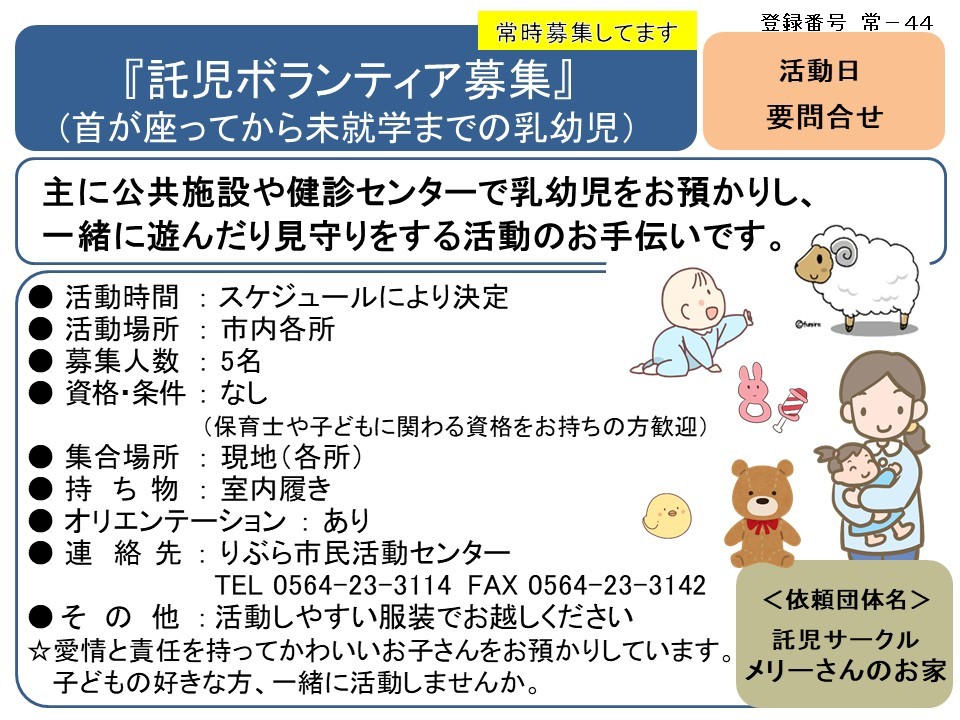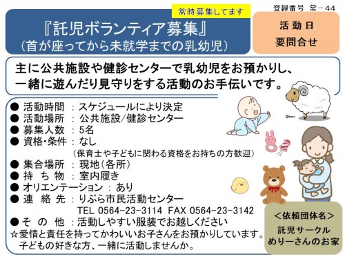 託児ボランティア募集 (首が座ってから未就学までの乳幼児)