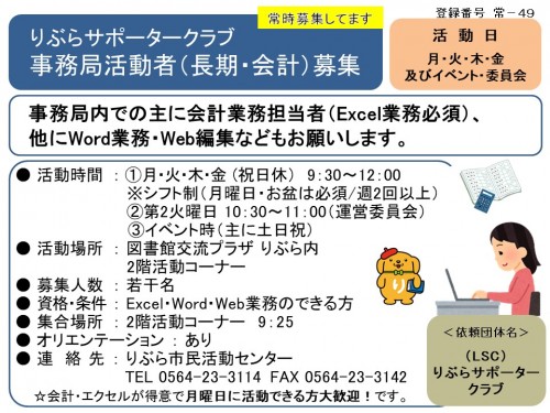 りぶらサポータークラブ 事務局活動者(長期・会計)募集≪常-49まちびとバンク≫