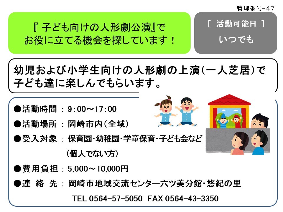 『 子ども向けの人形劇公演』で お役に立てる機会を探しています!≪管理番号-47まちびとステージ≫