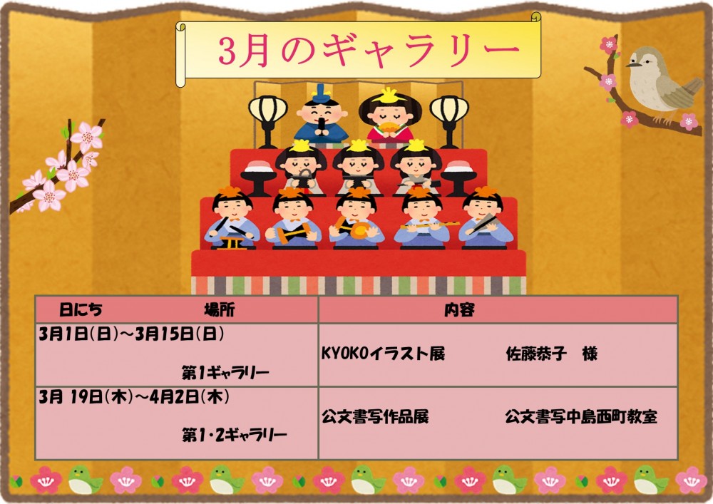 3月のギャラリー展示のお知らせです。 KYOKOイラスト展では可愛らしい作品が並び、公文書写作品展では子どもたちの元気な習字作品が飾られます。ぜひ見に来てください。おまちしております。