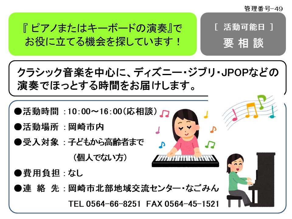 『 ピアノまたはキーボードの演奏』で お役に立てる機会を探しています!≪管理番号-49まちびとステージ≫