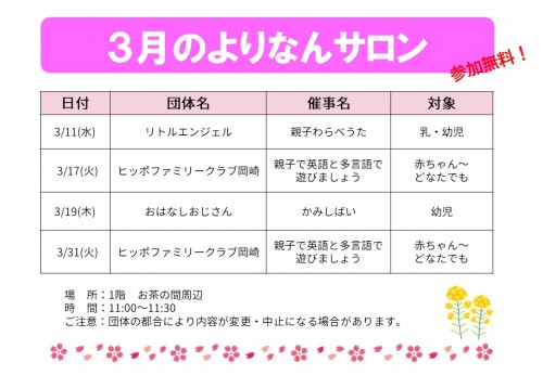3月のよりなんサロンの開催日をお知らせします。
