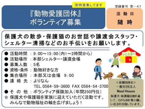 『動物愛護団体』 ボランティア募集≪常-47まちびとバンク≫