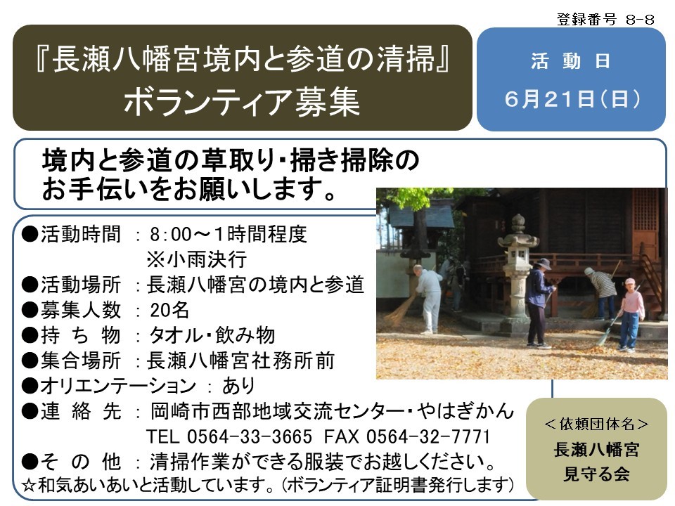 『長瀬八幡宮境内と参道の清掃』 ボランティア募集≪8-8まちびとバンク≫