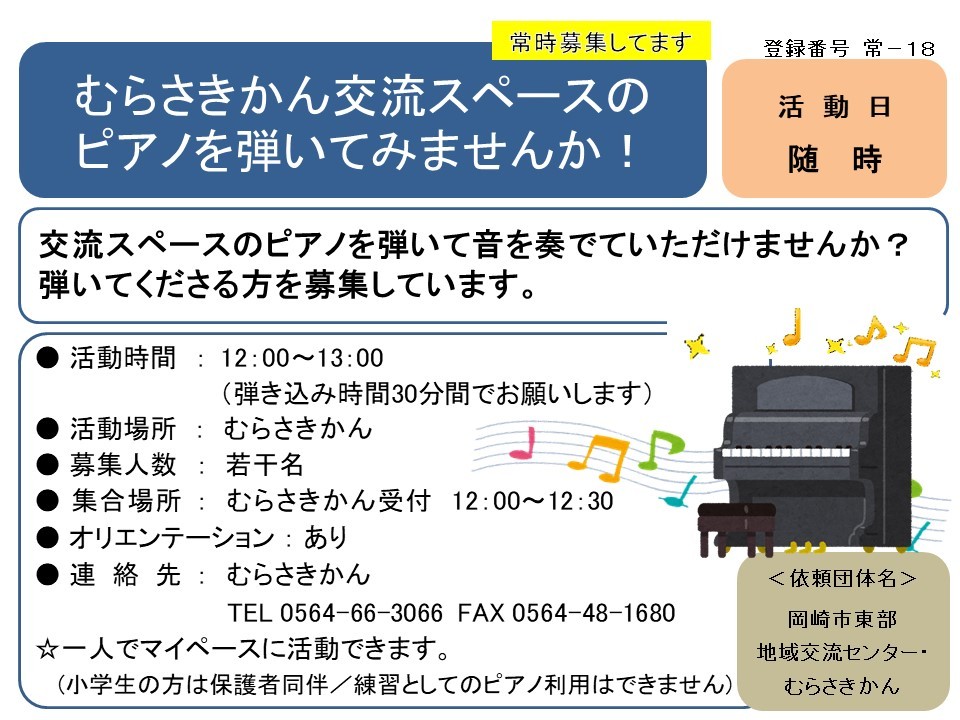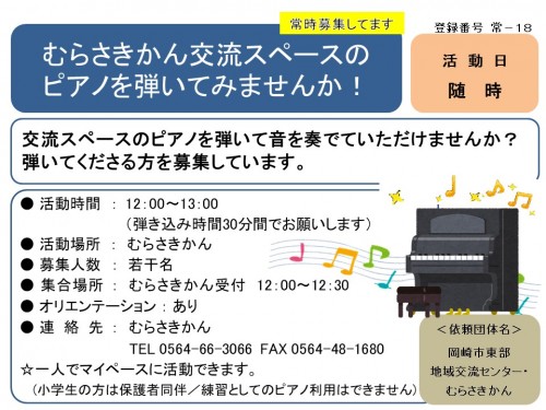 むらさきかん交流スペースの ピアノを弾いてみませんか!≪常-18まちびとバンク≫